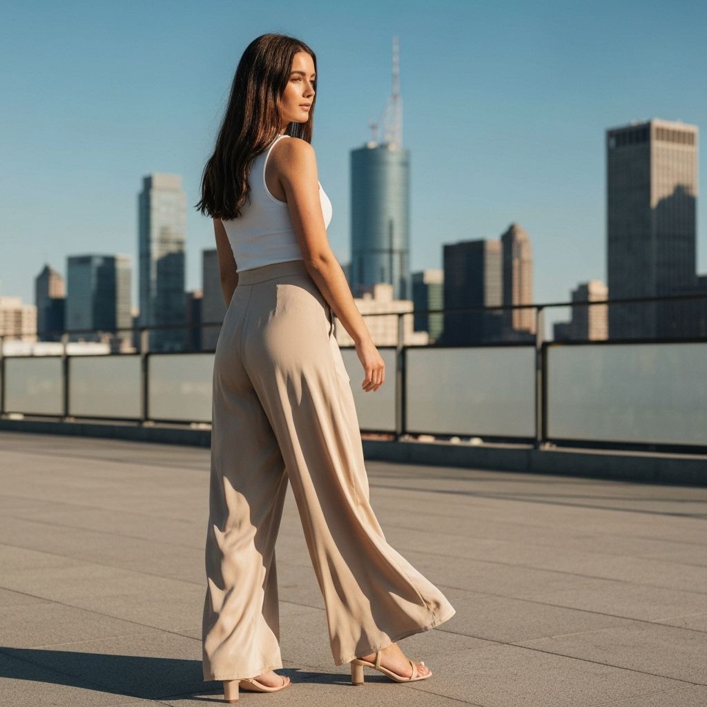Pantalón de pierna ancha con tiro alto, combina comodidad y estilo contemporáneo.